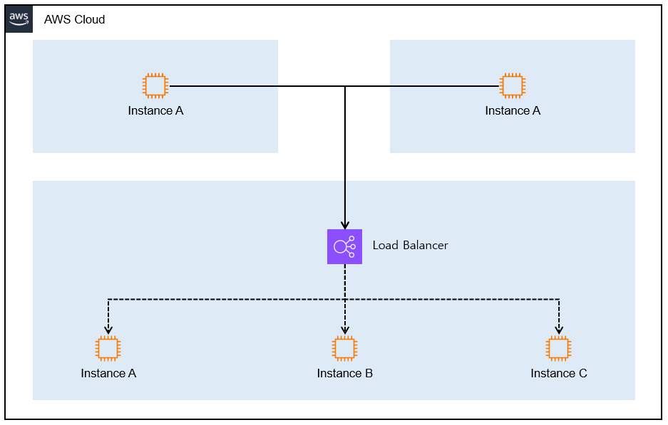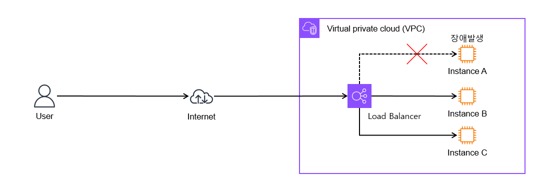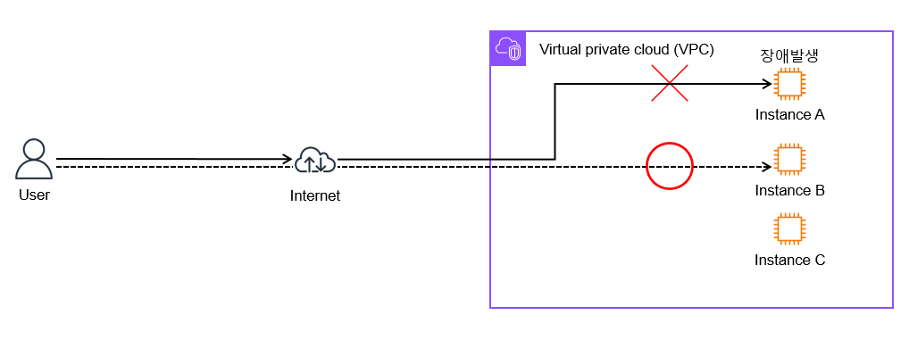 그림과 같이 다수의 서버를 구성하여 서비스를 제공하면, 인스턴스 A에 장애 발생시에도 인스턴스 B나 인스턴스 C를 통해 서비스를 받을 수 있습니다. 하지만 서비스 타깃을 사용자 입장에서 일일이 지정을 해주어야 한다는 문제가 존재합니다.