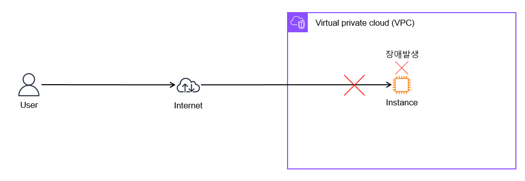 VPC 내 단일 서버를 통한 서비스 구성하여 사용자가 접근하는 환경에서 단일 서버가 장애가 발생 되면 서비스를 받을 수 없습니다.