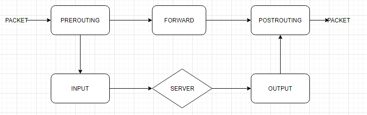Chain은 패킷이 조작될 상태를 지정하며 iptables에 내장된 기본 Chain은 다음과 같다.