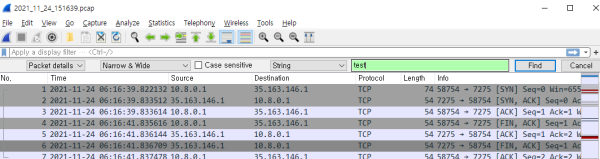 - 다양한 목적으로 특정 문자열이 포함된 패킷을 찾는 기능이 필요한 경우가 많다. 메뉴 Edit > Find Packet 또는 단축키 Ctrl+F를 이용하면 문자열/Hex값/정규식 등으로 특정 문자열이 포함된 Packet을 검색할 수 있는 기능을 제공한다.