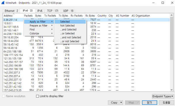 - 또한, 원하는 endpoint 라인에서 우측마우스 버튼으로 제공하는 메뉴를 이용하면 Filter로 적용하던가 Find의 범위를 지정하던가 해당 패킷의 색깔을 변경하는 등 해당 패킷들에 대한 자세히 분석할 수도 있다.