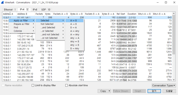 - 또한, 원하는 conversation에서 우측마우스 버튼으로 제공하는 메뉴를 이용하면 Filter로 적용하던가 Find의 범위를 지정하던가 해당 패킷의 색깔을 변경하는 등 해당 패킷들에 대한 자세히 분석할 수도 있다.