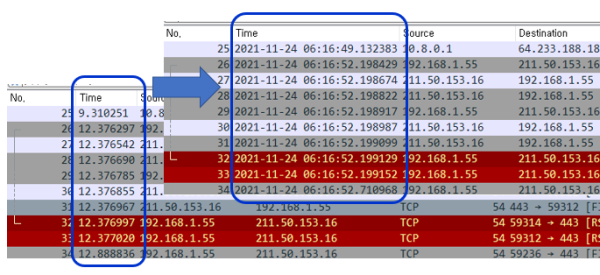 - Wireshark의 packet capture panel의 Time 칼럼의 표시방식을 경우에 따라서는 연월일시분초와 같은 종류의 표시가 필요한 경우가 있다. 예를 들면, 증적확보 또는 성능분석을 위해 Screenshot을 만들어야 하는 경우 등에는 날짜형식의 표시가 불가피하게 필요하다.