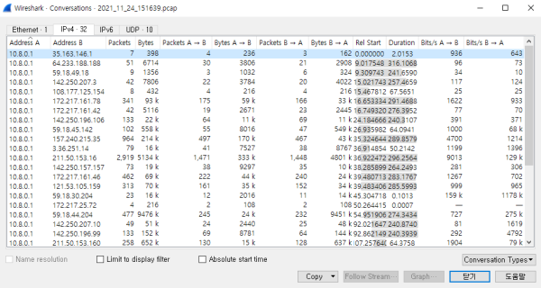 - 수집된 수많은 패킷 중에서 특정 호스트 간의 패킷에 대한 통계정보를 보기 원한다면 메뉴 Statistics > Conversations를 이용하여 pps 또는 bps 단위의 패킷 통계정보를 확인할 수 있다.