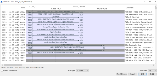 - 메뉴 Statistics > Flow Graph를 선택하면, 캡쳐된 packet을 Flow관점으로 그려서 보여준다.