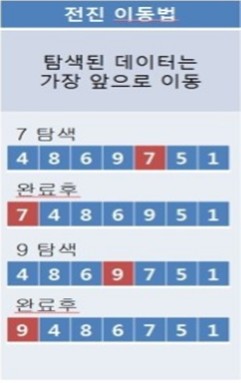 - 전진 이동법 (Move To Front): 탐색된 데이터는 가장 앞으로 이동