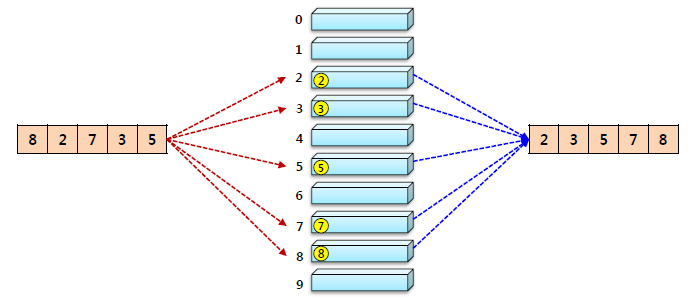 레코드를 비교하지 않고 준비된 버킷을 이용하여 정렬하는 방법