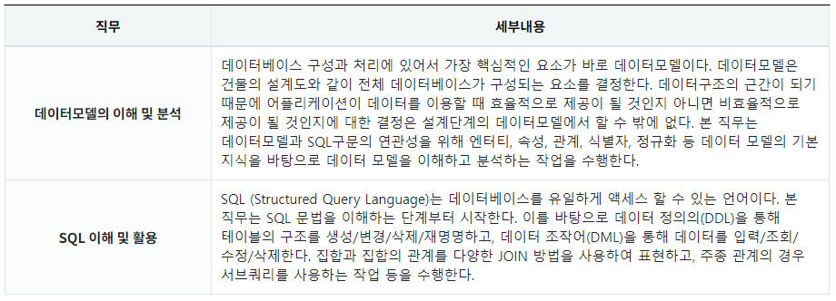 SQL 개발자는 데이터모델링에 기본 지식을 바탕으로 SQL 작성, 성능 최적화 등 데이터베이스 개체 설계 및 구현 등에 대한 전문지식 및 실무적 수행 능력을 그 필수로 한다.