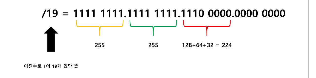19 = 3 옥텟의 3비트(16보다 3 더 크다) = 128+64+32 = 224
