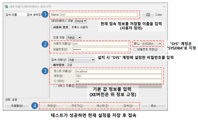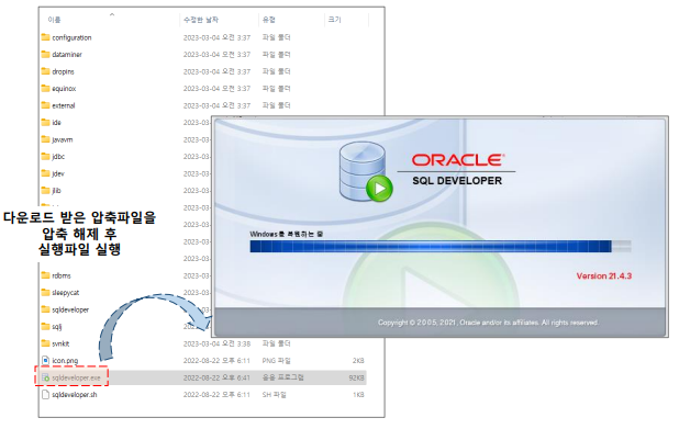 위 과정을 순서대로 이행하면 SQL 실습 도구인 SQL Developer프로그램을 사용하실 수 있습니다.