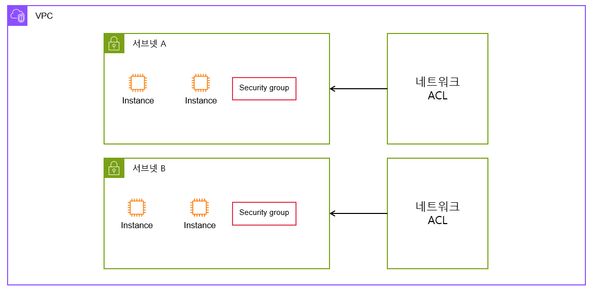 VPC는 인스턴스 레벨과 서브넷 레벨 상에서 대상을 필터링 할 수 있는 보안 기술을 가지고 있습니다. 인스턴스 레벨에서의 보안 기술은 보안 그룹(Security Group)이며, 서브넷 레벨에서의 보안 기술은 네트워크 ACL(Access Control List)입니다.