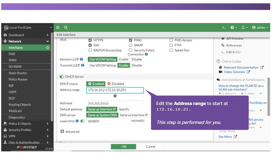- 주소 범위 : FortiGate가 장치에 할당하는 IP 주소 범위입니다.