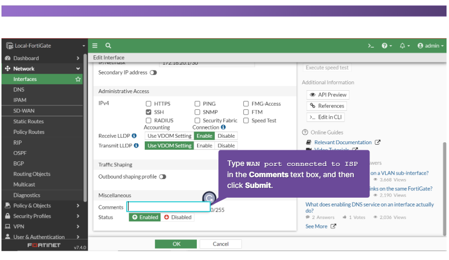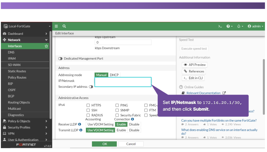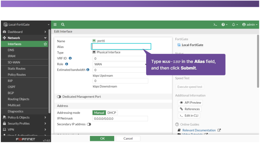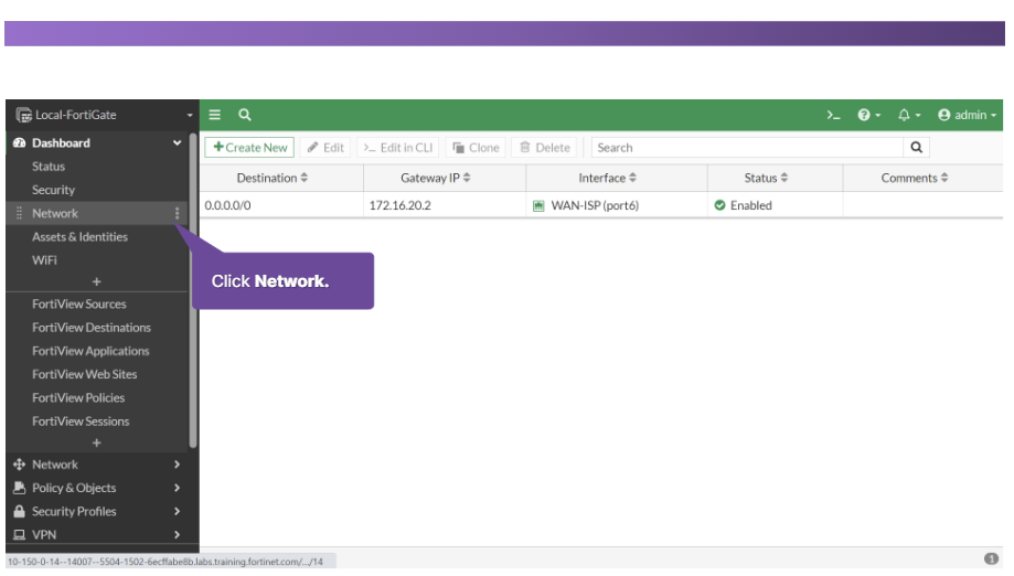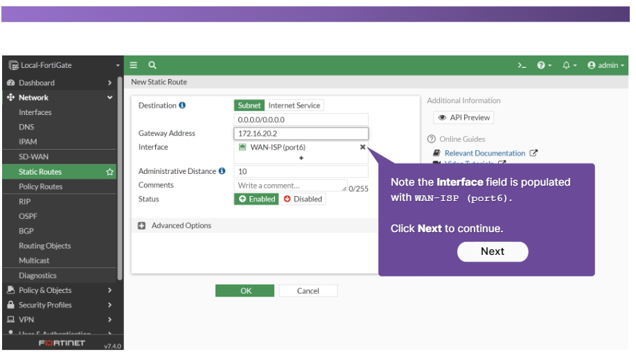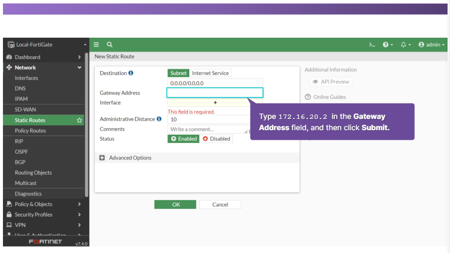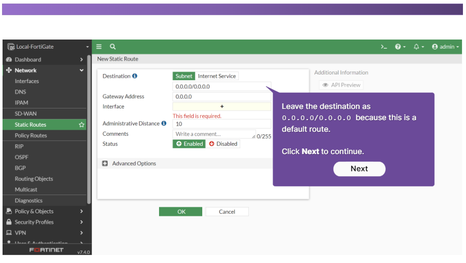 기본 경로에서는 대상 주소가 0.0.0.0으로 설정됩니다. 게이트웨이 주소는 일반적으로 FortiGate와 네트워크 에지 사이에 있는 네트워크의 장치이거나 FortiGate가 네트워크 에지에 있는 경우 ISP 네트워크의 일부인 다른 라우터의 주소입니다. 마지막으로 인터페이스는 해당 라우터(일반적으로 WAN 인터페이스) 에 연결되는 FortiGate 포트입니다.