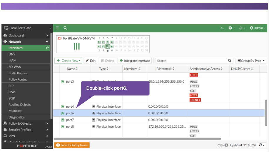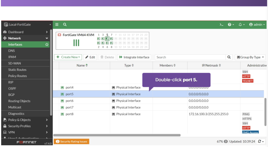 GUI 에서 우측의 Network 메뉴를 클릭하면 하위 메뉴 중 Interfaces를 클릭하면 인터페이스 목록을 볼 수가 있습니다.강의에선 Port 5번을 선택하도록 합니다.