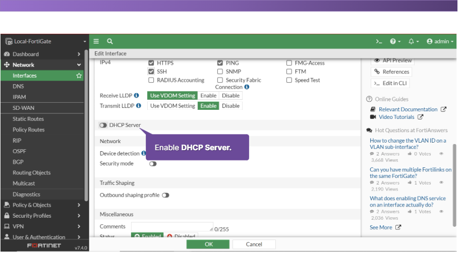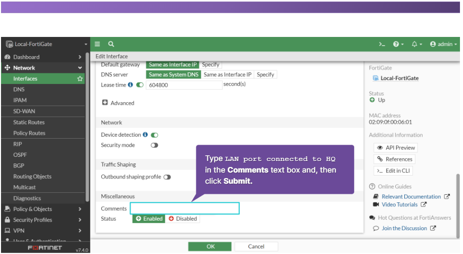 - 기본 게이트웨이 : FortiGate가 장치에 할당하는 기본 게이트웨이입니다. 기본 게이트웨이는 인터페이스 IP 주소가 디폴트 값입니다.
