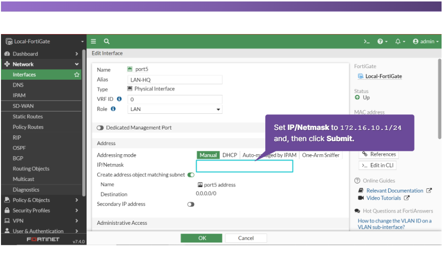 - 게이트웨이 주소: FortiGate가 트래픽을 전달하는 IP 주소입니다.