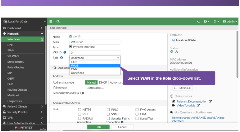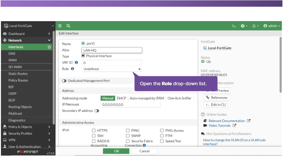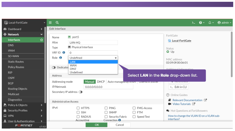 해당 인터페이스를 어떤 식으로 사용할지 할당을 해줘야한다. Role의 드롭 화살을 누르면 여러가지 목록이 나옵니다. 강의에선 LAN 선택을 합니다.
