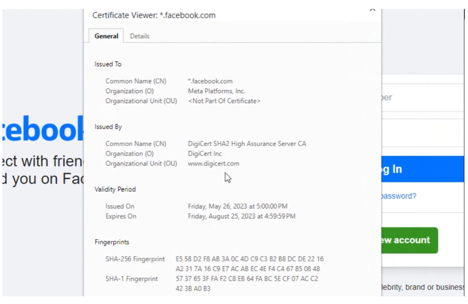 브라우저를 통해 페이스북에 접속 뒤 인증서를 살펴보면 Facebook 자체의 인증서가 보이시는걸 확인 할 수 있습니다. 비교를 위해 아래에 예외 전의 인증서 정보를 추가해 두도록 하겠습니다.