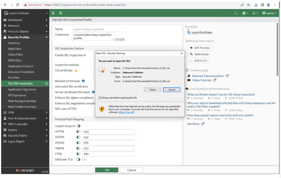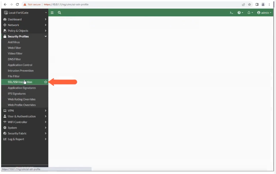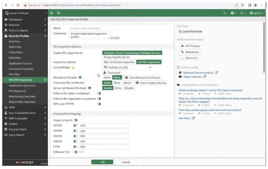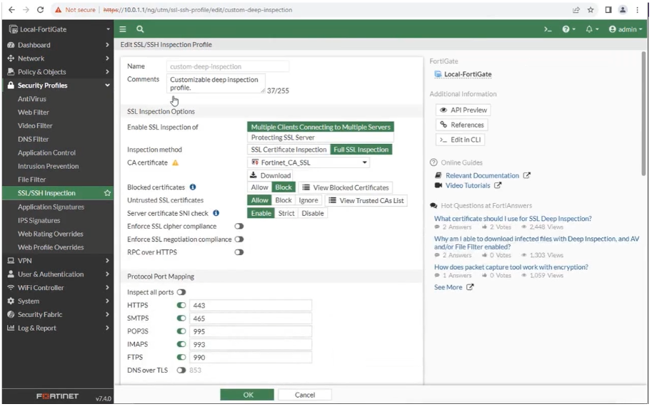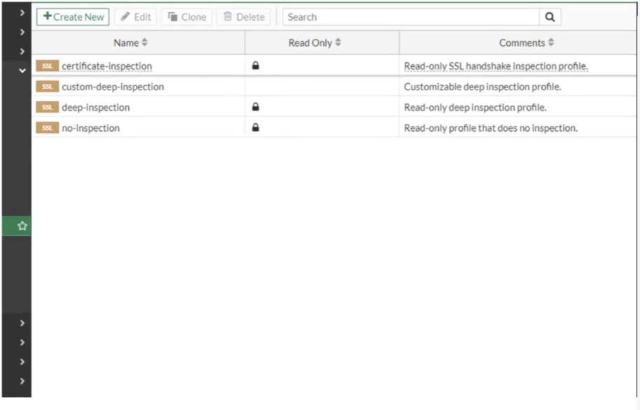 FortiGate SSL 검사를 사용하려면 SSL 검사 프로필을 방화벽 정책에 적용합니다. FortiOS에는 4개의 사전 로드된 SSL 검사 프로필이 포함되어 있으며 그 중 3개는 읽기 전용입니다.