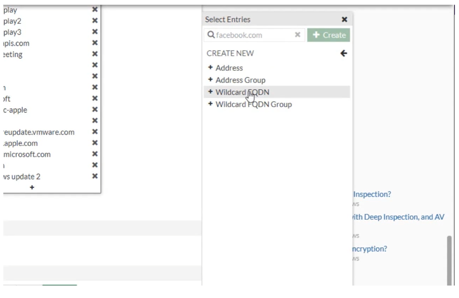 Facebook.com을 추가하기 위해 + 버튼을 클릭 후 주소를 해당 리스트에 추가해 주도록합니다. 만약 주소가 없다면 Create 버튼을 눌러 주소를 먼저 생성해 주도록합니다. Wildcard FQDN을 클릭 하여 사진과 같이 애스터리스크와 facebook.com을 입력 후 생성을 마무리합니다. 후에 해당 주소를 리스트에 추가 후 편집을 마무리합니다.