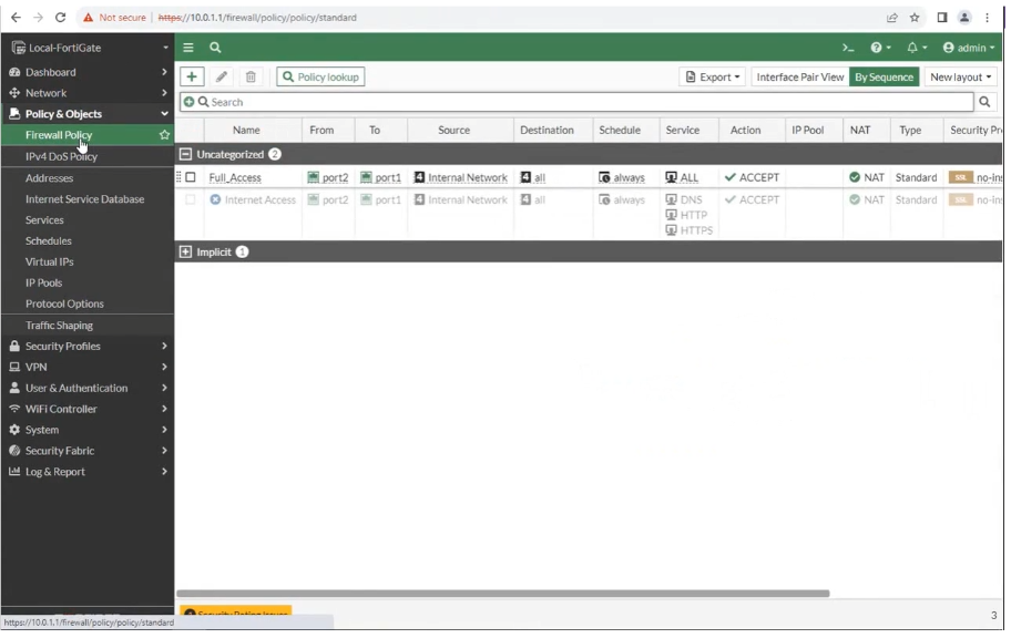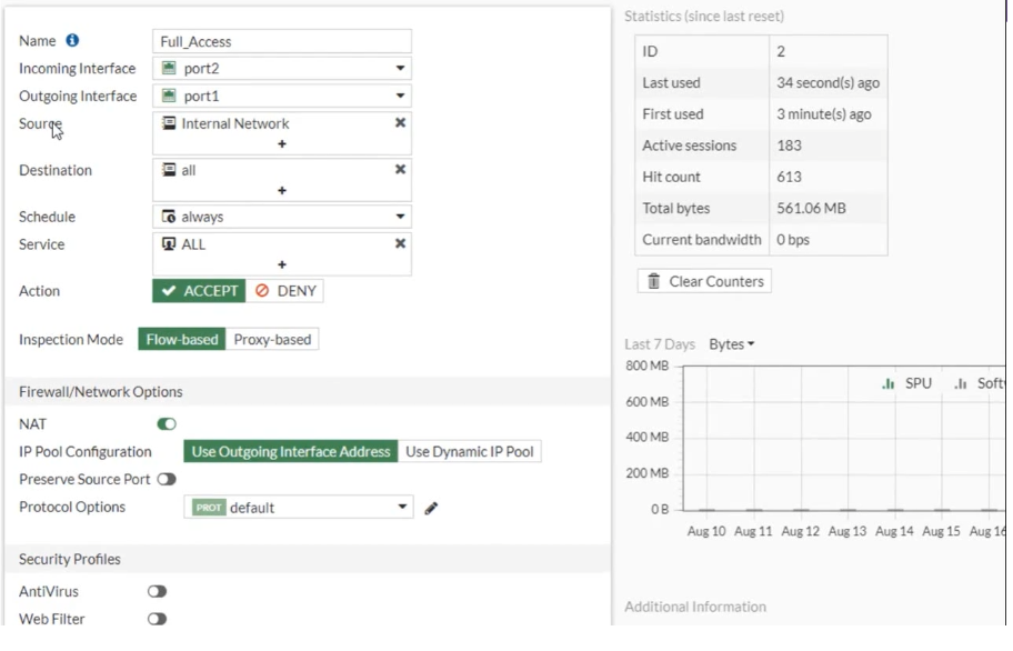 다시 Policy & Objects의 하위메뉴인 Firewall Policy로 접근하여 적용할 정책을 클릭합니다. 여기선 Full Access 정책에 접근을 하네요.