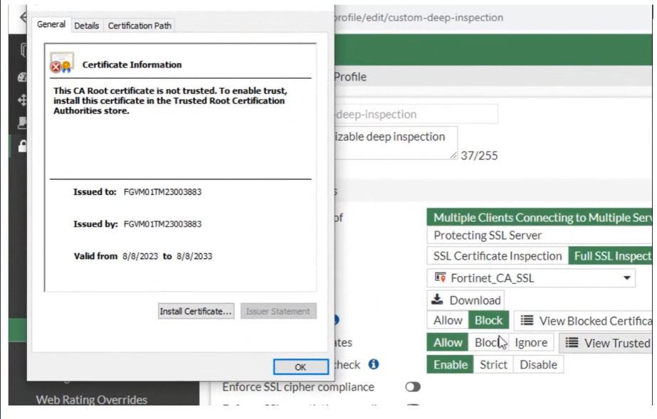 SSL 인증서 검사를 사용하는 경우에도 인증서 오류가 나타날 수 있습니다. FortiGate는 CA 인증서를 사용하여 HTTPS를 통해 차단된 사이트를 탐색하려고 할 때 나타나는 대체 메시지를 암호화하기 때문입니다.