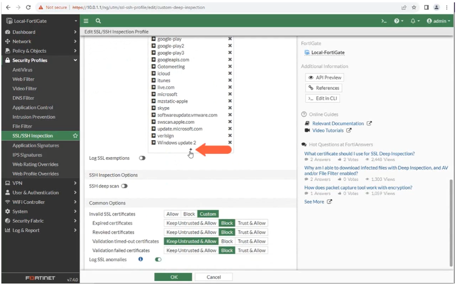 먼저 Fortigate의 custom deep inspection 편집 창으로 돌아갑니다. 스크롤을 내리면 상기와 같이 특정 주소를 추가하여 SSL 검사 예외 할 수있습니다.