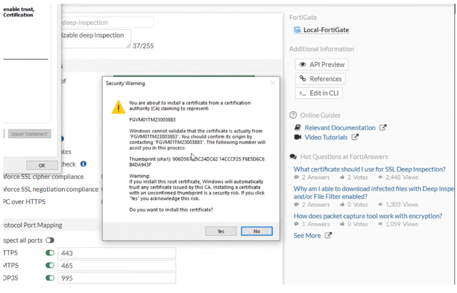 FortiGate CA 인증서를 사용하여 SSL 심층 검사를 사용하면 HTTPS 사이트에 연결할 때마다 브라우저에 인증서 경고가 표시됩니다. 이는 FortiGate가 다음과 같은 인증서를 생성하기 때문에 발생합니다. 올바른 사이트에 있지만 브라우저가 기본적으로 신뢰하는 CA가 아닌 FortiGate CA에 의해 서명되었습니다. 이는 FortiGate가 중간자 공격을 수행하는 것처럼 보입니다.