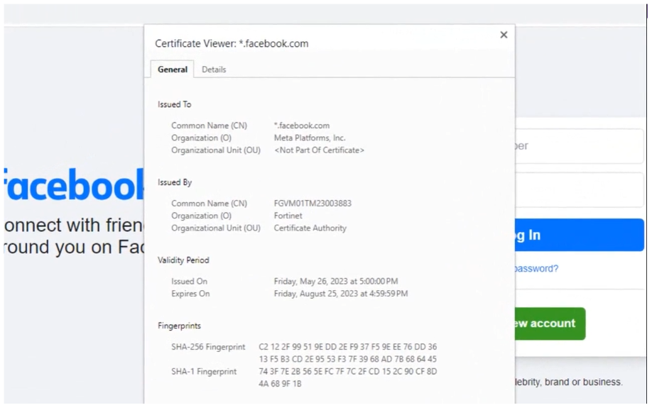 예를 들어 네트워크 사용자가 facebook.com에 연결합니다. Facebook 웹 서버의 트래픽은 잘 알려진 CA에서 서명한 실제 Facebook 인증서를 사용합니다. FortiGate는 이 트래픽을 가로채서 해독합니다. 그런 다음 안전하다고 판단되면 FortiGate는 트래픽을 최종 사용자에게 전달합니다. 이제 트래픽은 facebook.com이라는 이름의 인증서를 사용하지만 인증서는 FortiGate CA에서 서명됩니다.