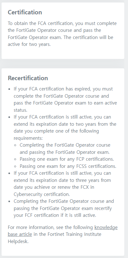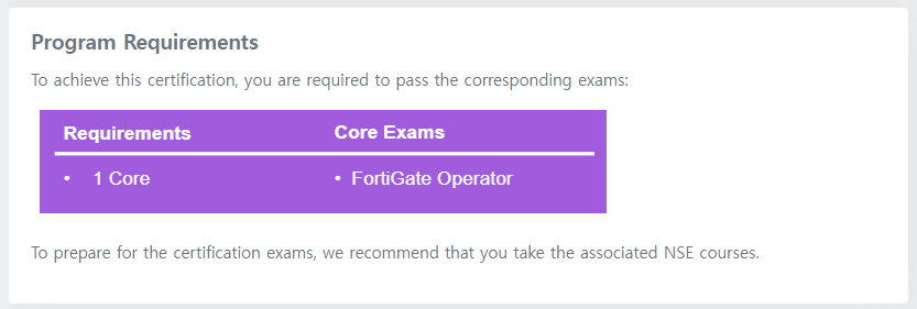 해당 과정은 1Core (FortiGate Operator)로 구성되어있고, 해당 과정 수료 후, Exam을 통과하면 취득 성공입니다.
